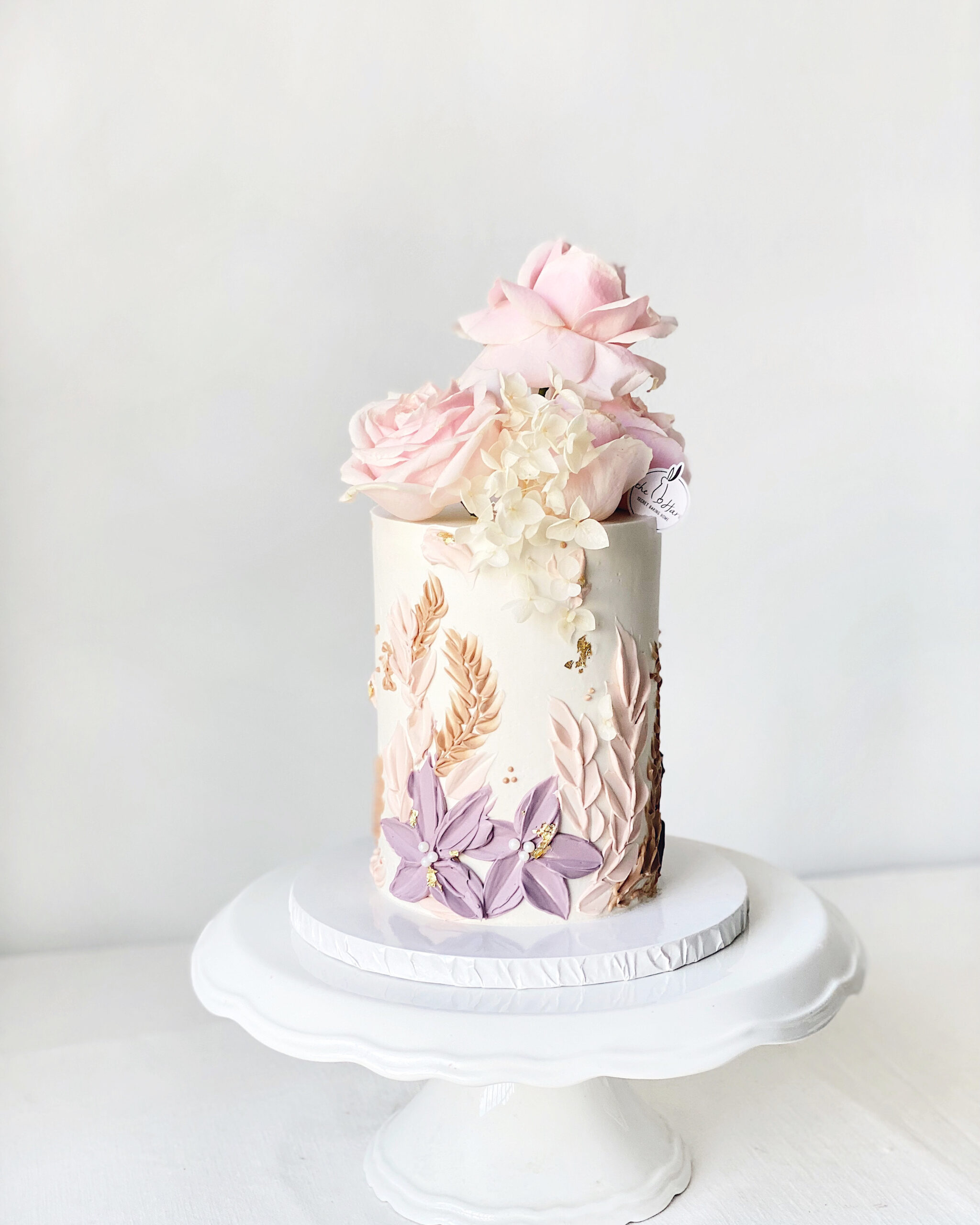 This tall, buttercream-coated masterpiece boasts a lovely canvas of hand-painted flowers in shades of dusty pink, purple, and light brown.