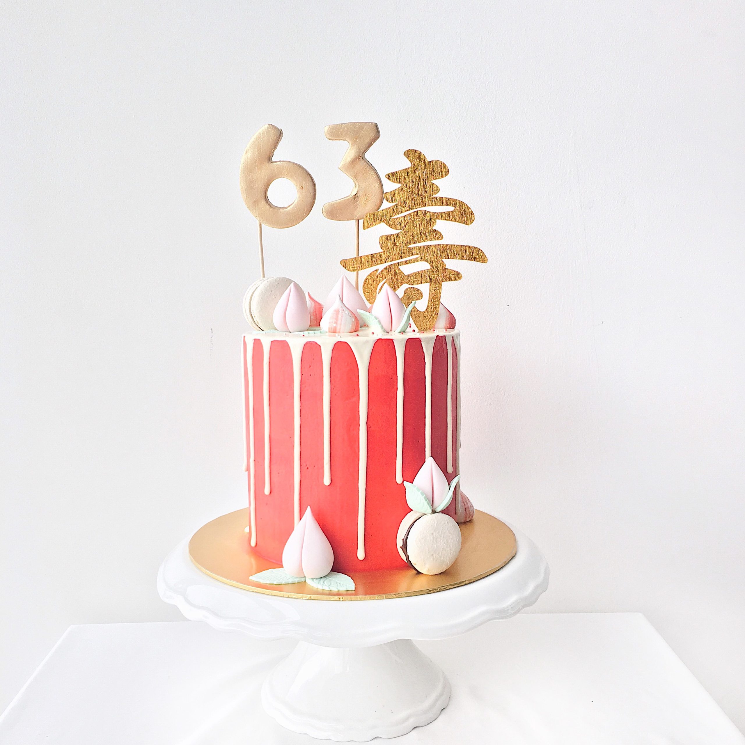 The red cake represents happiness and good fortune, while the peaches and macarons symbolize sweetness and abundance.